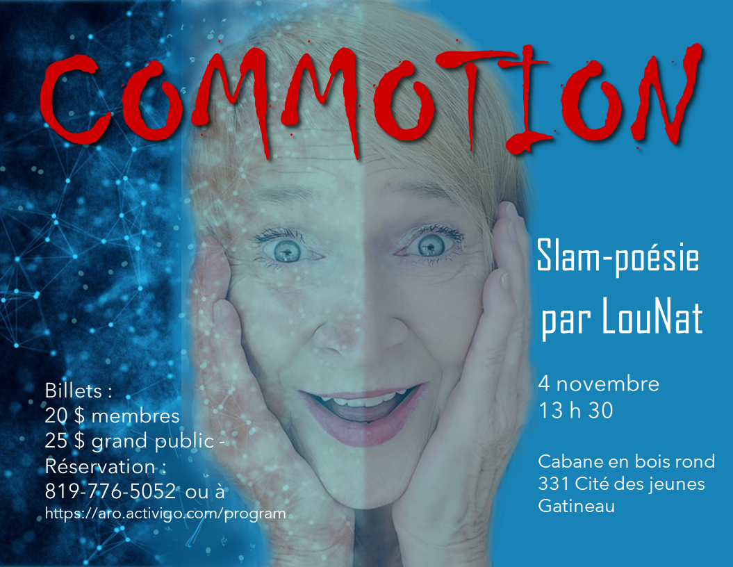« Ça a causé toute une commotion. » Entendue enfant par LouNat, cette expression se réverbère en trame de fond tout au long de ce spectacle solo. En une douzaine de poèmes accessibles à tous, introduits avec humour, LouNat sonne l’heure juste et s’exprime avec entrain et émotion face à l’intelligence artificielle, le déficit d’attention, l’âgisme, les psychotropes, la prolifération des armes à feu et autres sujets autour desquels une commotion souvent se crée.